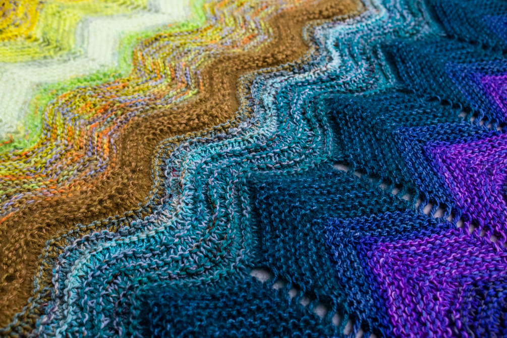 There are three simple textures and chevron/wave variations repeated throughout the fabric to keep you engaged and motivated to reach each new section. Enjoy knitting this cozy stash busting blanket!*