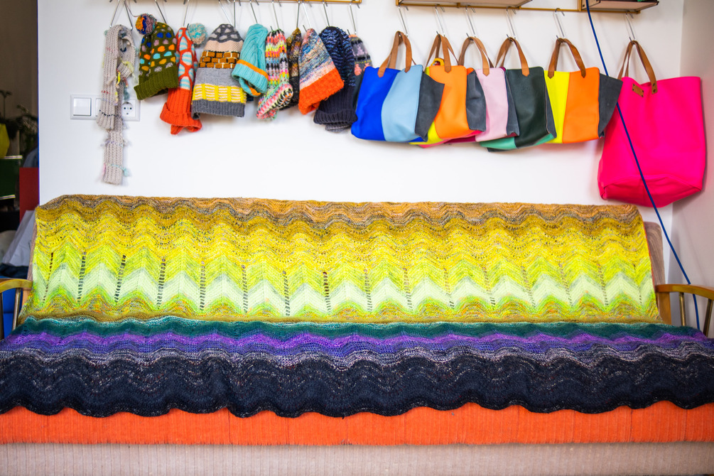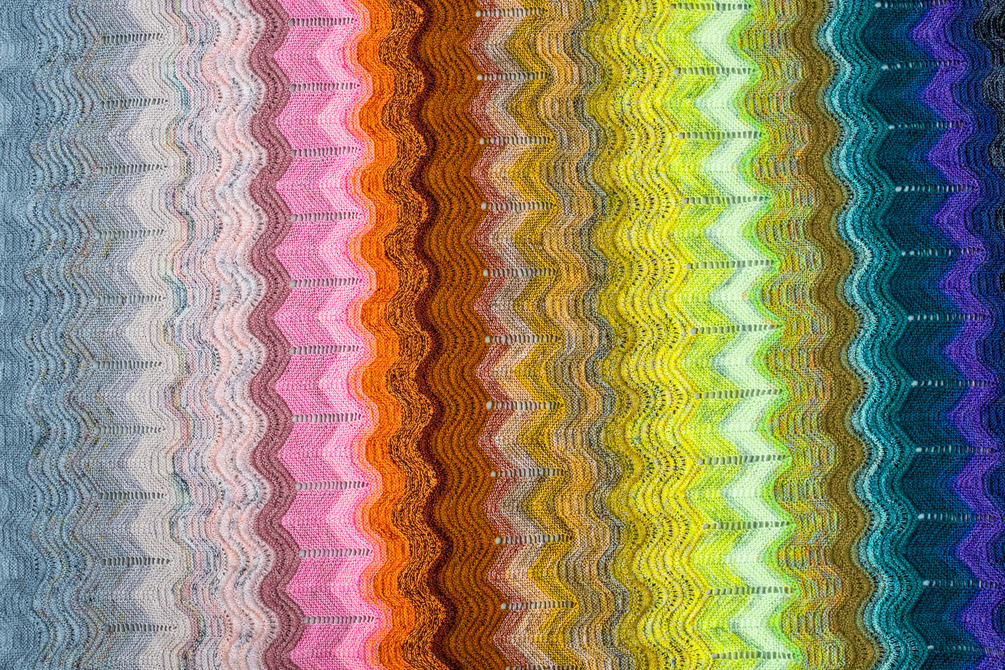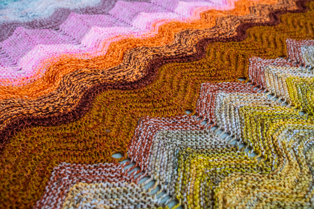 This blanket is designed as a stash buster to use all of your leftover fingering weight yarns and single skeins. Always hold two strands of fingering weight yarn together or mix in some lace weight mohair silk or suri alpaca yarns too.The instructions include detailed notes on how to blend your leftover yarns and single skeins together to achieve smooth melted color transitions. You can knit the blanket as long as you want for a decorative throw on your couch.