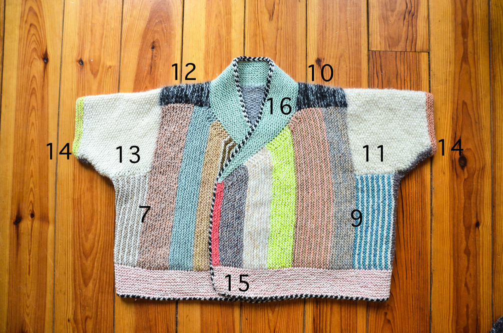 As you knit each section, you can refer to this front and back view to visualize and plan your color choices. Each number corresponds to that section’s number in the written instructions.