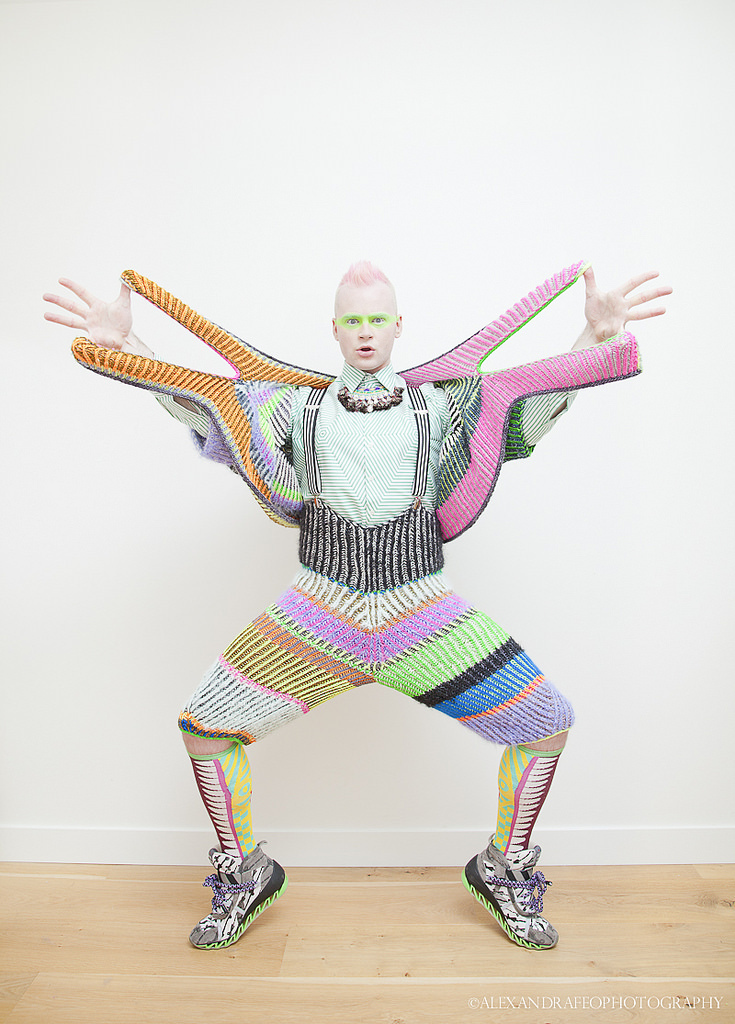 The sample mainly consists of Malabrigo Mecha, a heavy worsted weight yarn, but the gauge is also appropriate for worsted weight contrast colors like Malabrigo Worsted. Feel free to mix different fibers together like wool, angora, alpaca, and mohair.