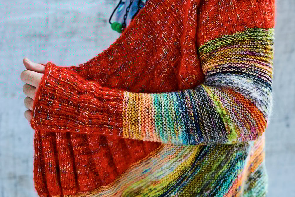 Use a variety of fingering weight yarns held double. Add some Qing Fibre Melted Suri or lace weight mohair silk for fluffy stripes.