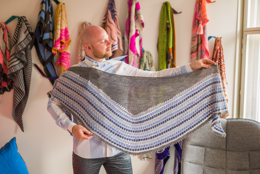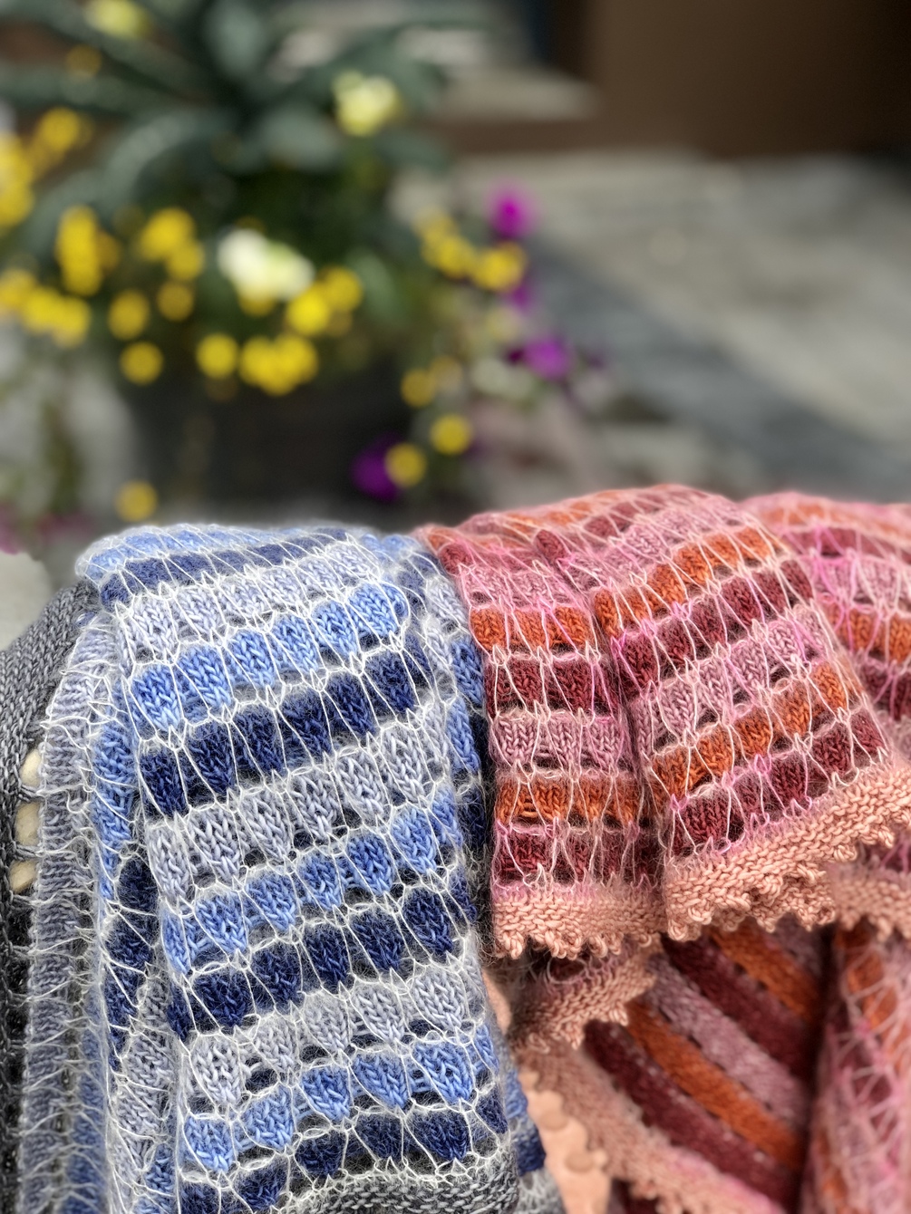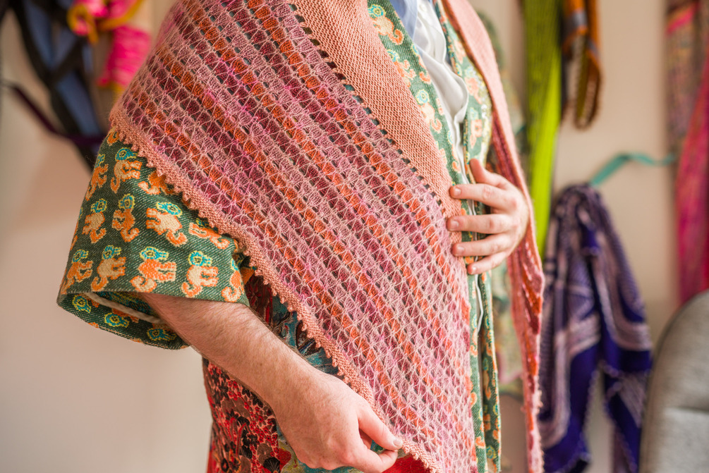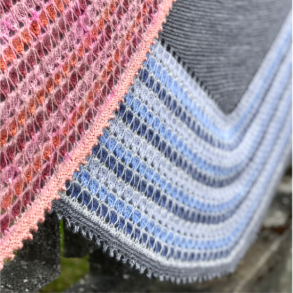 This delightful colorwork shawl is knit top-down with four shades of fingering weight yarn plus a fifth accent color in lace weight mohair silk. Begin with a larger short row triangle using Westknits Shortcut Rows. Then continue with simple stripes and a mesmerizing slip stitch pattern that is very easy to knit. This pattern is beginner friendly with easy stitches and clear instructions. The mohair slip stitch v’s float on top of the fabric, adding a delicate whimsy to the crescent shaped shawl. The border is knit in garter stitch with a picot bind off.